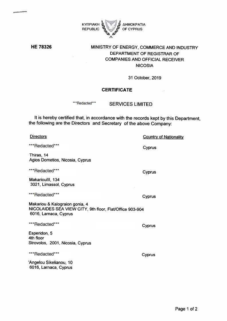 - Due Diligence – confirmation of a Cyprus company’s existence