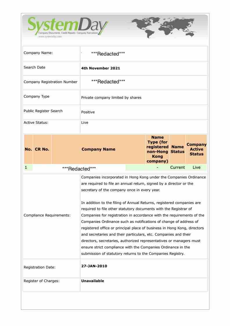 We can supply a Hong Kong Certificate of Good Standing/ Certificate of Continuing Registration from the Hong Kong Registrar of Companies.