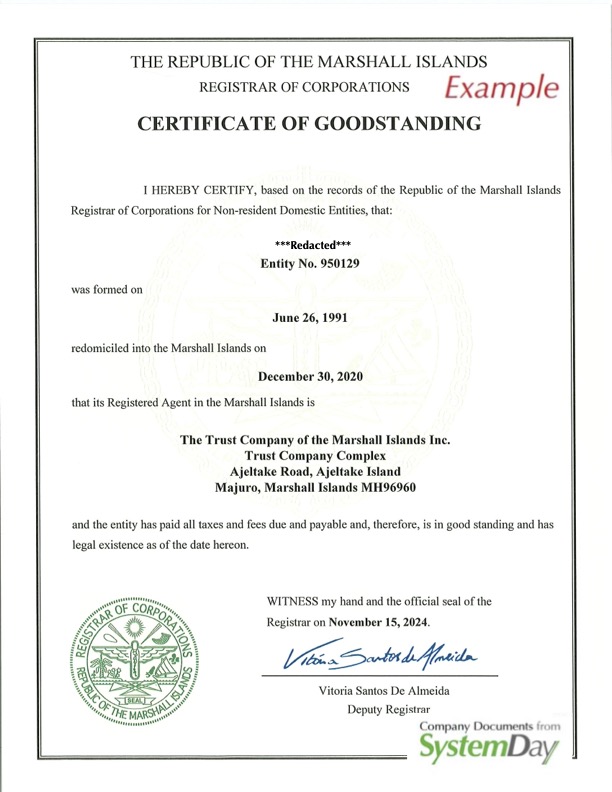 We can supply a Certificate of Good Standing from the Marshall Islands Registrar of Corporations for registered companies.