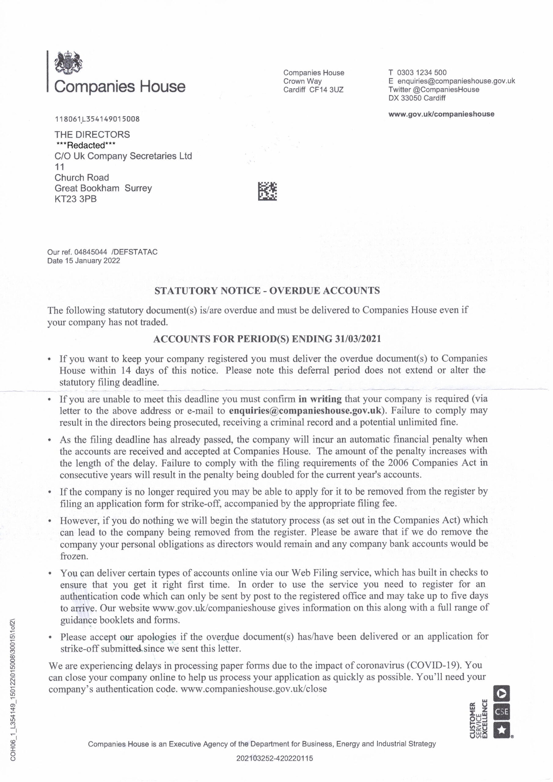 The year end Accounts or Confirmation Statement for your company are overdue and must be delivered to Companies House even if your company has not traded.